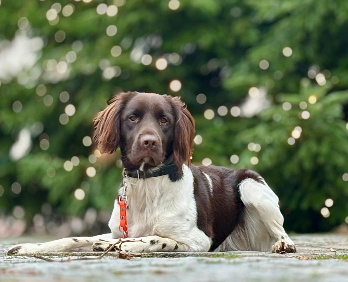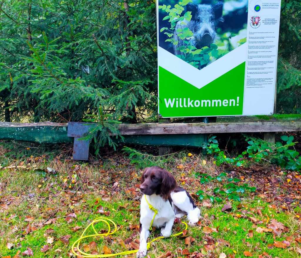 Mit 11,5 Monaten hat Flinte im Schwarzwildgatter Segebergerheide das Leistungszeichen S, Jagen an Schwarzwild erbracht. Am Gattereingang ging die Nase hoch und im direkten Weg zu einem Tannengebüsch. Dort brachte sie mit kräftigem Standlaut einen Keiler ordentlich in Bewegung.
